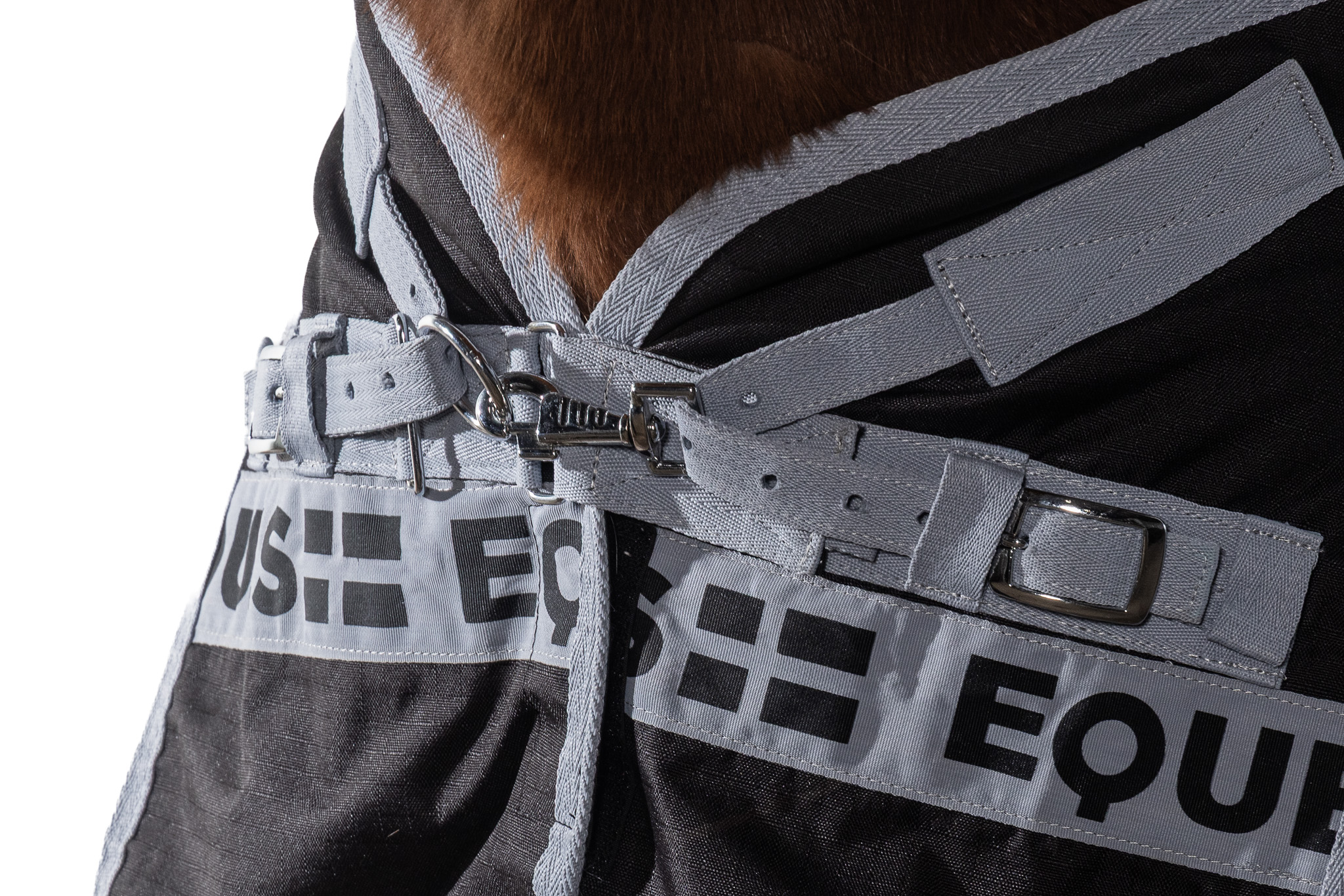 The rug is secured with cross surcingles, a V-front closure, elastic and removable leg straps, as well as a removable tail strap for maximum flexibility and stability.